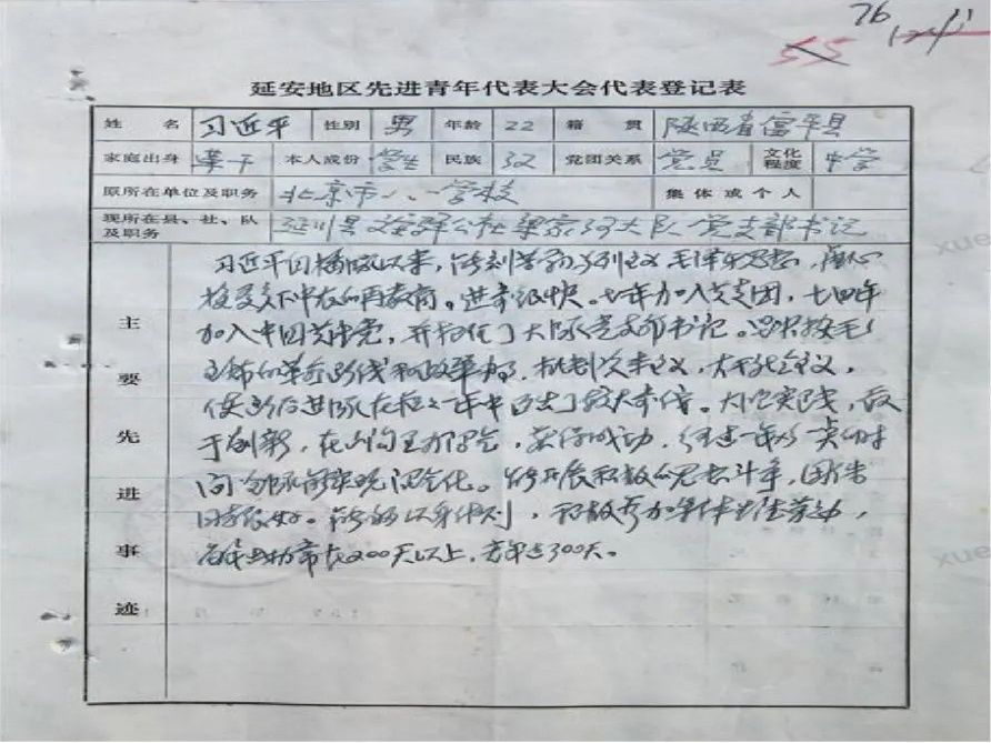 延安地区先进青年代表大会代表登记表(来源:《习近平的七年知青岁月》)