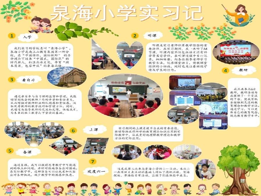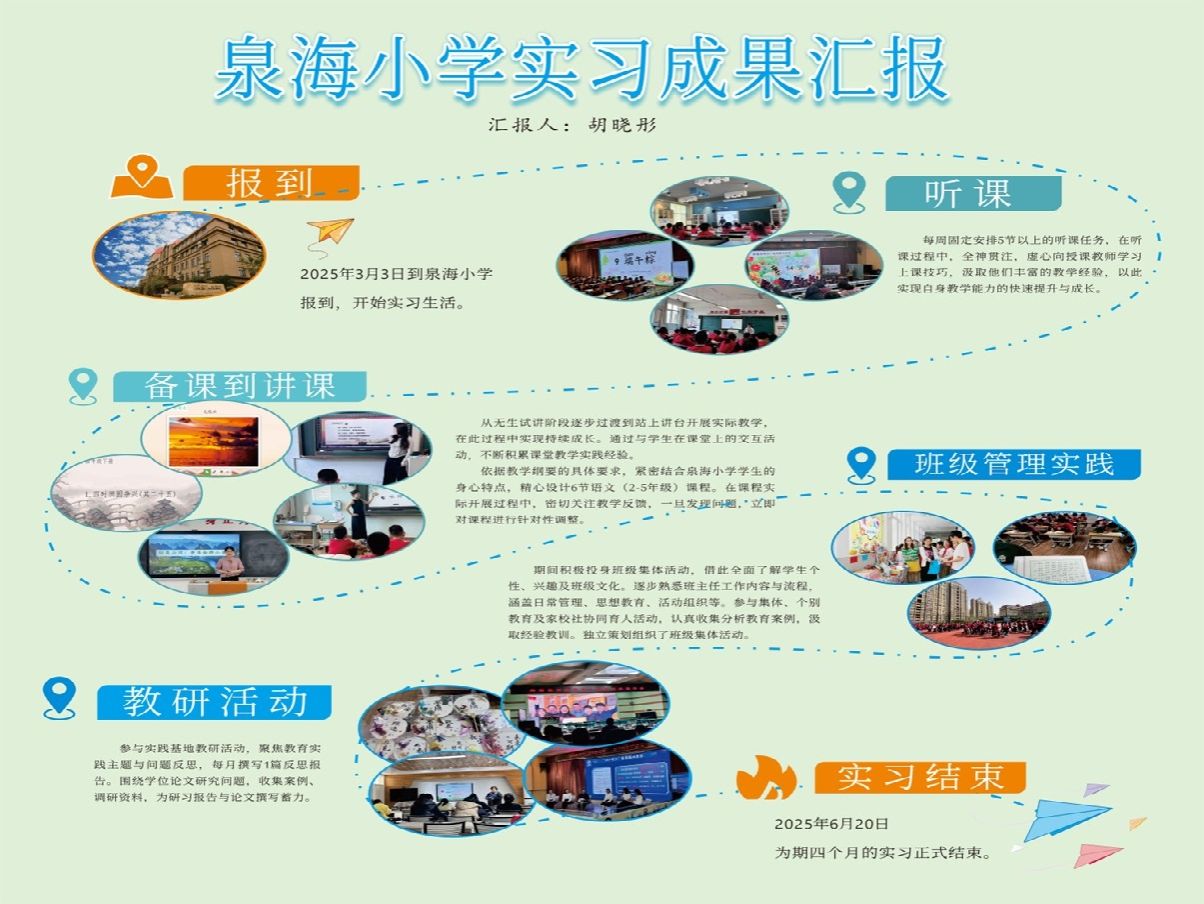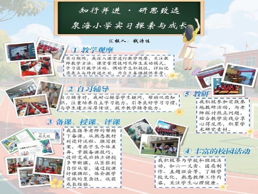 2025年春日,公司2023级5位小学教育领域研究生怀揣教育热忱,走进泉海小学,开启了一段从“理论探索者”到“实践引路人”的成长之旅。在鲜活的教育场景中,5位研究生严于律己、以身作则,以“准教师”身份深度融入校园生活。实习期间,她们立足小学学段特点,将教育学原理与儿童认知规律相结合,在语文课上以情境教学唤醒阅读热情,在数学课中用生活化案例破解抽象概念,在班队活动中以童心视角设计成长课程,运用多媒体工具打造“互动课堂”,让知识在童趣中自然生长。