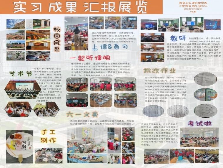尹晓彤:时光如流水,从白雪寒冬到炎热夏季,为期四个月的实习生活已然接近尾声。经过这段时间的实习,我深刻地感受到了教育工作者的辛劳和责任感,也收获了很多宝贵的经验。它使我的教学理论变为教学实践,使虚拟教学变为真正的面对面教学。在实习期间不仅增强了我的时间观念,还磨炼了我的耐心、爱心和恒心,同时也增强了我成为一名合格教师的信心。我相信,经过自己不断的总结探索和努力,终能成为一名合格的优秀教师。