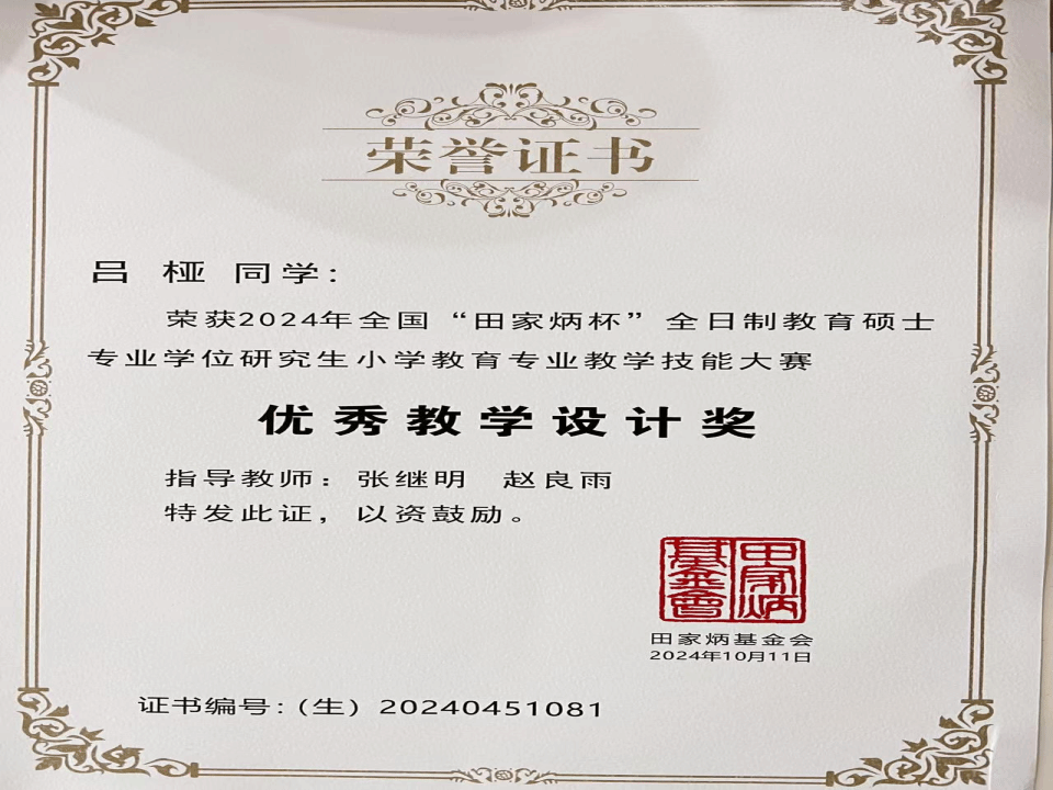 近日,2024年全国“田家炳杯”全日制教育硕士专业学位研究生“小学教育”、“特殊教育”领域教学技能大赛相继落下帷幕,三亿体育乔福强副教授指导的特殊教育专业研究生董婉晴、侯艳分别荣获全国一等奖、三等奖,张继明副教授指导的小学教育专业研究生吕桠获得“优秀教学设计奖”,乔福强老师获得“优秀指导教师”,公司代表三亿体育官网取得了优异成绩。