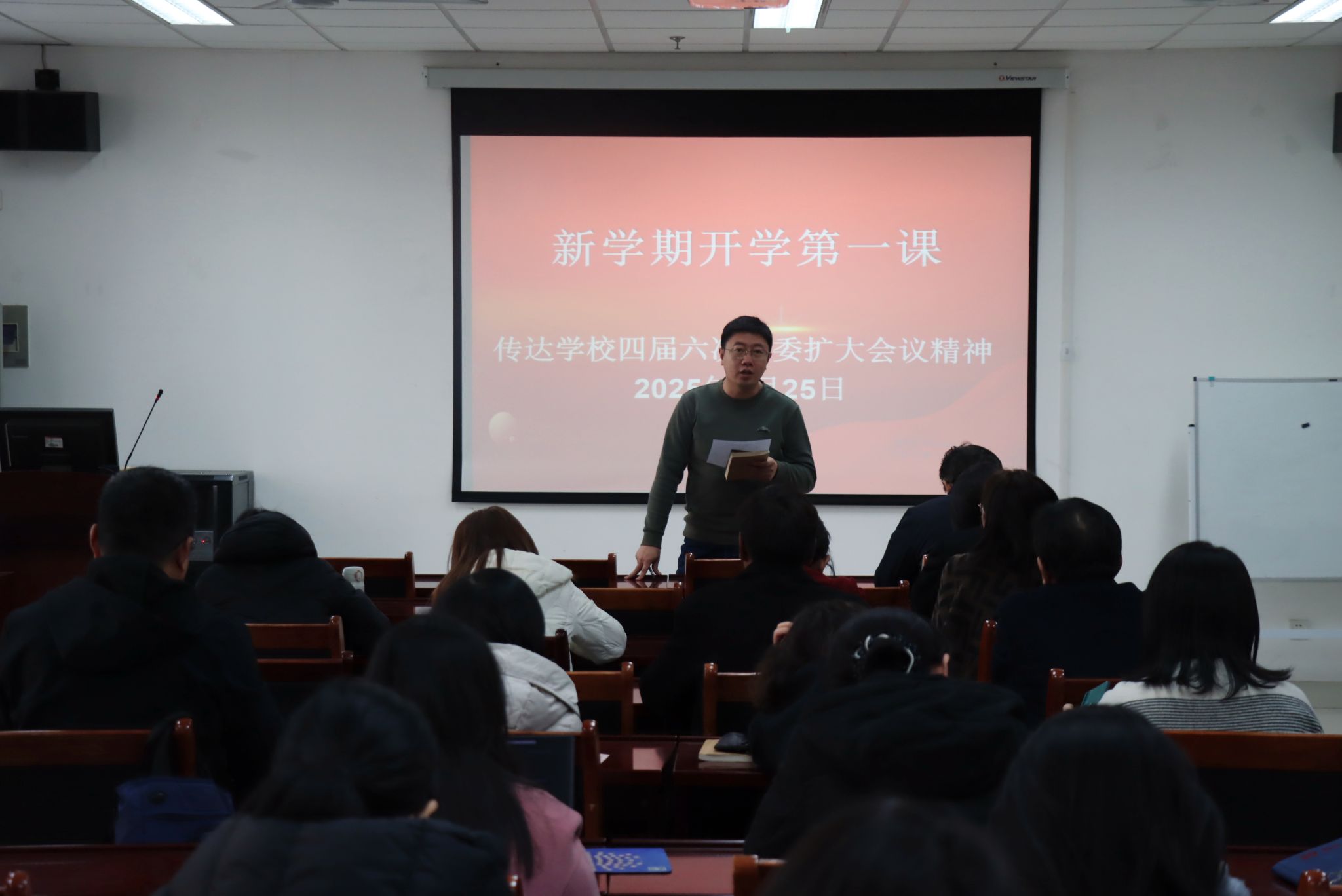 2月25日,三亿体育召开全体教职工“开学第一课”,传达学习三亿体育官网四届六次全委扩大会议精神。公司党委书记季竹君主持会议并讲话,全体教职工参加会议。