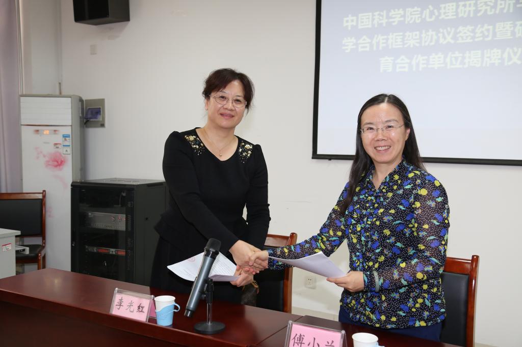 李光红副董事长与傅小兰所长交换合作框架协议书,并共同为“中国科公司心理研究所研究生教育合作单位”揭牌。