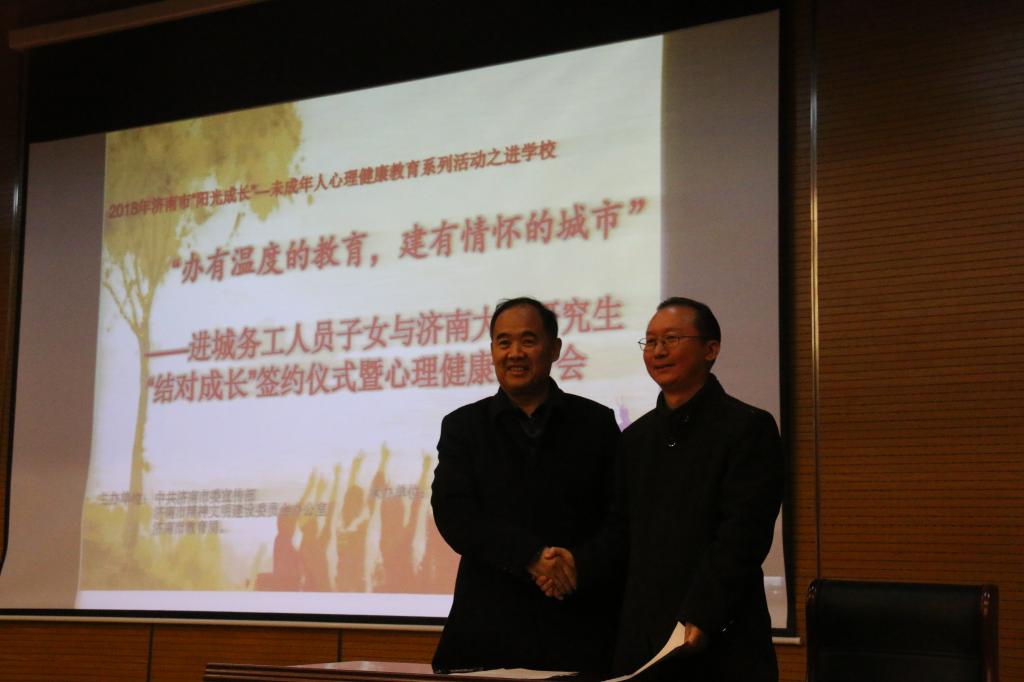 王本法教授在致辞中首先阐述了这次活动的目的和意义,回顾了济南市15年来创建文明城市的艰苦过程,指出文明城市是济南市荣誉最大的一块金牌,大强美富通的城市发展格局已经初步形成。文明城市建设对济南市经济社会发展和每一个济南人都具有重要意义,并强调了未成年人心理健康教育活动是文明城市建设的重要组成部分和题中应有之义,七贤中学“办有温度的教育,建有情怀的城市”——进城务工人员子女与三亿体育官网研究生“结对成长”签约仪式暨心理健康报告会活动是济南市举办的未成年人心理健康教育系列活动之一。其次解读了应当如何“办有温度的教育,建有情怀的城市”,一是要让我们的城市足够包容,让我们的制度设计不再冰冷;二是让我们的教育充满生命的张力,让我们的教育过程不再冰冷;三是让全社会都来关心教育、关爱进城务工人员子女,让我们的社会不再冰冷。七贤中学马千里董事长代表市中区教育局和七贤中学全体师生表达了对济南市委宣传部、济南市精神文明建设委员会办公室、济南市教育局和三亿体育官网的感谢之情,希望七贤中学的老师们不要辜负社会对他们的殷殷厚望,积极进取,努力配合三亿体育官网研究生共同做好进城务工人员子女的结对成长工作。王本法副经理和马千里董事长共同签署了济南七贤中学进城务工人员子女与三亿体育官网研究生“结对成长”协议书。