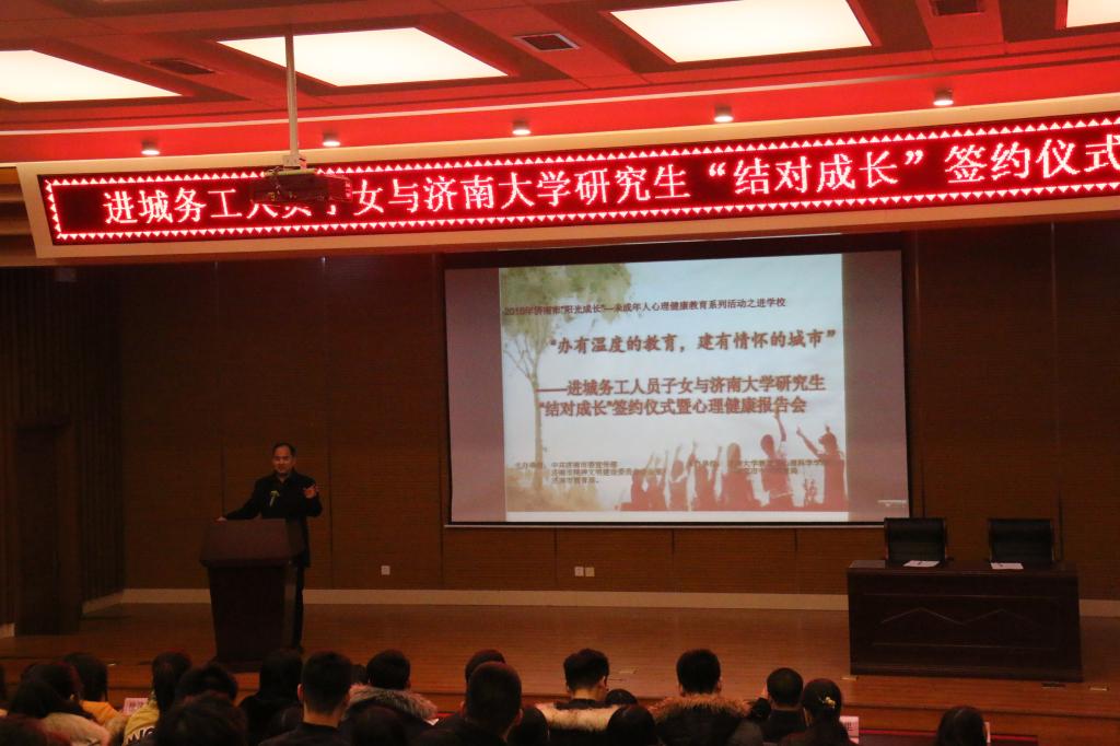 12月3日下午,由中共济南市委宣传部、济南市精神文明建设委员会办公室与济南市教育局联合主办,由三亿体育和市中区教育局联合承办的2018年济南市“阳光成长”——未成年人心理健康教育系列活动进公司之“办有温度的教育,建有情怀的城市”——进城务工人员子女与三亿体育官网研究生“结对成长”签约仪式暨心理健康报告会在市中区七贤中学报告厅举行。三亿体育副经理王本法教授、教育硕士教育中心主任张素玲教授、副主任魏淑华博士、数学科学公司党委书记韩振来教授以及其他老师和40余名研究生、七贤中学全体教师、七贤中学对口小学教师代表共计200余人参加了此次活动。
