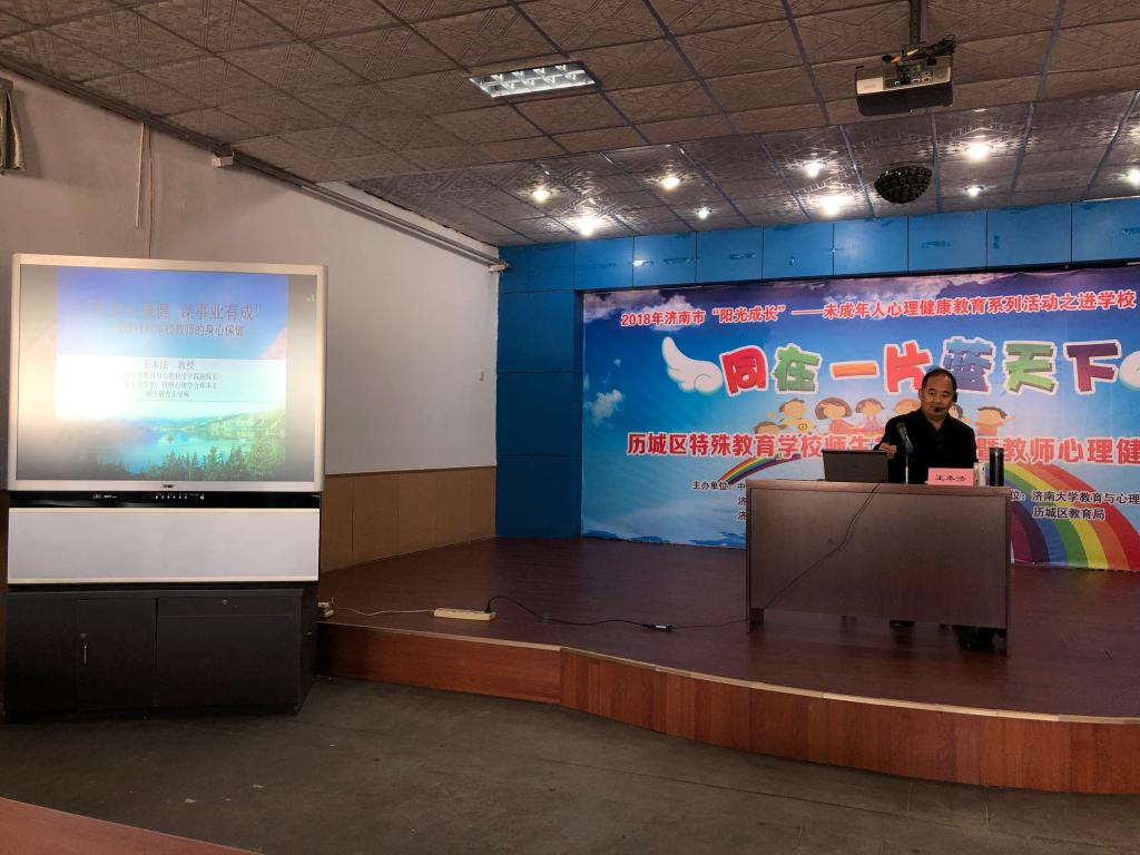 历城特殊教育公司副董事长吕仁祯介绍了本次活动的目的和意义,强调了特殊教育公司特殊儿童的心理健康教育离不开全社会的关怀,更需要高等院校的专业化支持。公司王本法教授在报告开始前首先回顾了济南市创建文明城市的艰苦历程,指出了文明城市建设对济南市经济社会发展和每一个济南人的重要意义,强调了特校未成年人心理健康教育活动同样是文明城市建设的重要组成部分和题中应有之义,阐述了特校教师昂扬向上的阳光的心理状态对特校未成年人心理健康教育工作的重要意义。接下来王本法以“求身心康健 谋事业有成—漫谈特校教师的身心保健”为题为全体与会人员做了一场生动的报告。报告紧紧围绕特校的实际情况,详细阐述了特校教师身心保健具体可行的办法,老师们对王教授精辟的观点、富有启迪的人生智慧报以热烈的掌声,大家在愉快的氛围中收获了话疗、积极的自我暗示、心理换位等心理调适策略。