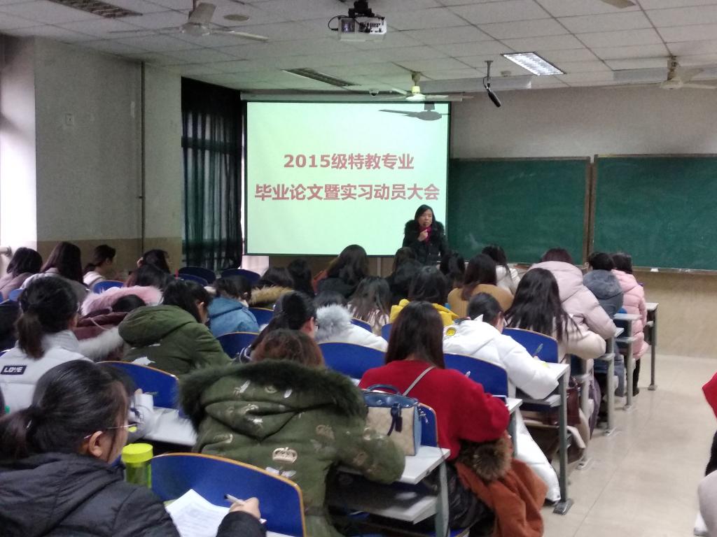 为做好15级特教专业员工的毕业论文及实习工作,特教系于12月25日第七、八节课,在第一教学楼203教室召开了15级特教专业员工毕业论文暨实习动员大会,特教系全体教师以及15级特教专业所有员工参加了会议。