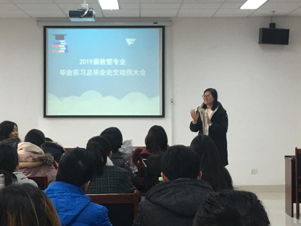 户外寒风凛冽,室内暖意融融。12月28日下午教育系召开2019届教管专业毕业实习及毕业论文动员大会。此次大会由教育系主任谢娟老师主持,张素玲老师、李燕老师、陈艳华老师、鞠严萍老师、李福春老师、陈磊老师、徐国英老师、王婷老师、王玲老师、虞宁宁老师,以及教管专业2015级全体本科生参加。