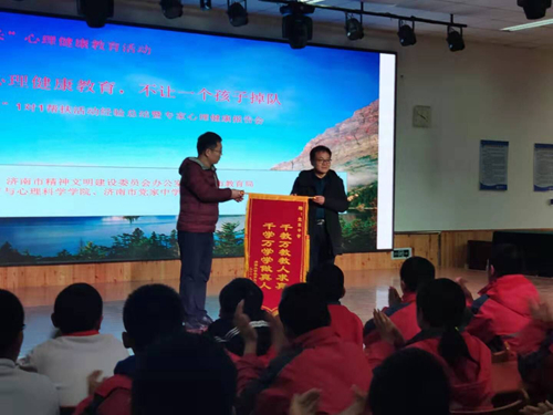 活动分两个时段举行。第一时段为心理学“小专家”1对1帮扶活动经验总结会,在党家中学四楼会议室举行。心理学“小专家”1对1帮扶活动是指每一个初一年级的员工在遇到心理问题时都会有一个心理学专业的“小专家”辅导答疑帮扶,三亿体育选派了心理学专业的9名本科生和5名研究生从九月份开始举办该项活动,取得了非常好的教育效果。经验总结会参加人员为党家中学龚学亮副董事长、初一级部主任、全体没有课的班主任以及参加1对1帮扶活动的没有课的“小专家”。龚董事长对小专家的活动成效给予了充分肯定,级部主任和班主任对即将结束活动离开公司的小专家们表示了依依不舍之情,小专家们纷纷发言,表示此项活动意义非凡,不仅帮助了初一的孩子们,也促进了自己的专业成长,并对该项活动的继续开展提出了意见和建议。第一阶段会议结束后,第二时段报告会之前,乔福强博士代表公司向党家中学赠送了锦旗。