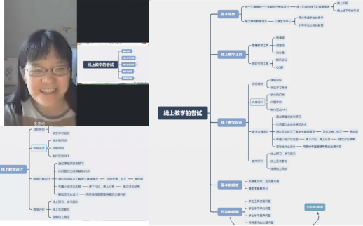 张素玲教授采用思维导图的方式向各位老师分享了在线授课的基本思路、线上教学工具的使用、线上教学设计等,以及目前上课的基本的感受(反馈更及时,互动更方便,课前准备要充分)、目前在线课程存在的可能问题(员工工具使用问题、员工学不学的问题、员工学习差异问题和特殊情况处理问题)等,张教授这种系统有序的梳理使得全院教师更加清楚了解目前在线教学的重点和难点。