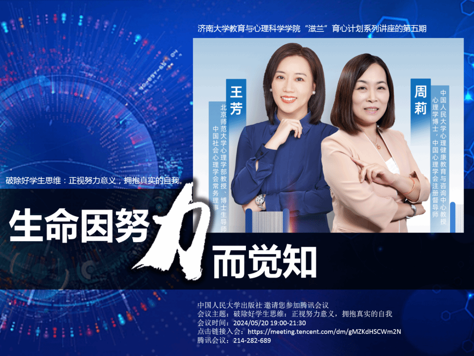 为深入探讨员工努力与生命意义之间的关系,鼓励员工们正视努力的真正价值,拥抱真实的自我,公司应用心理专业于2024年5月20日通过腾讯会议举办了“滋兰”育心计划系列讲座第五期——“生命因努力而觉知”。本次讲座吸引了心理专业员工的积极关注,共同聆听北京师范大学王芳教授和人民大学周莉教授的精彩发言。