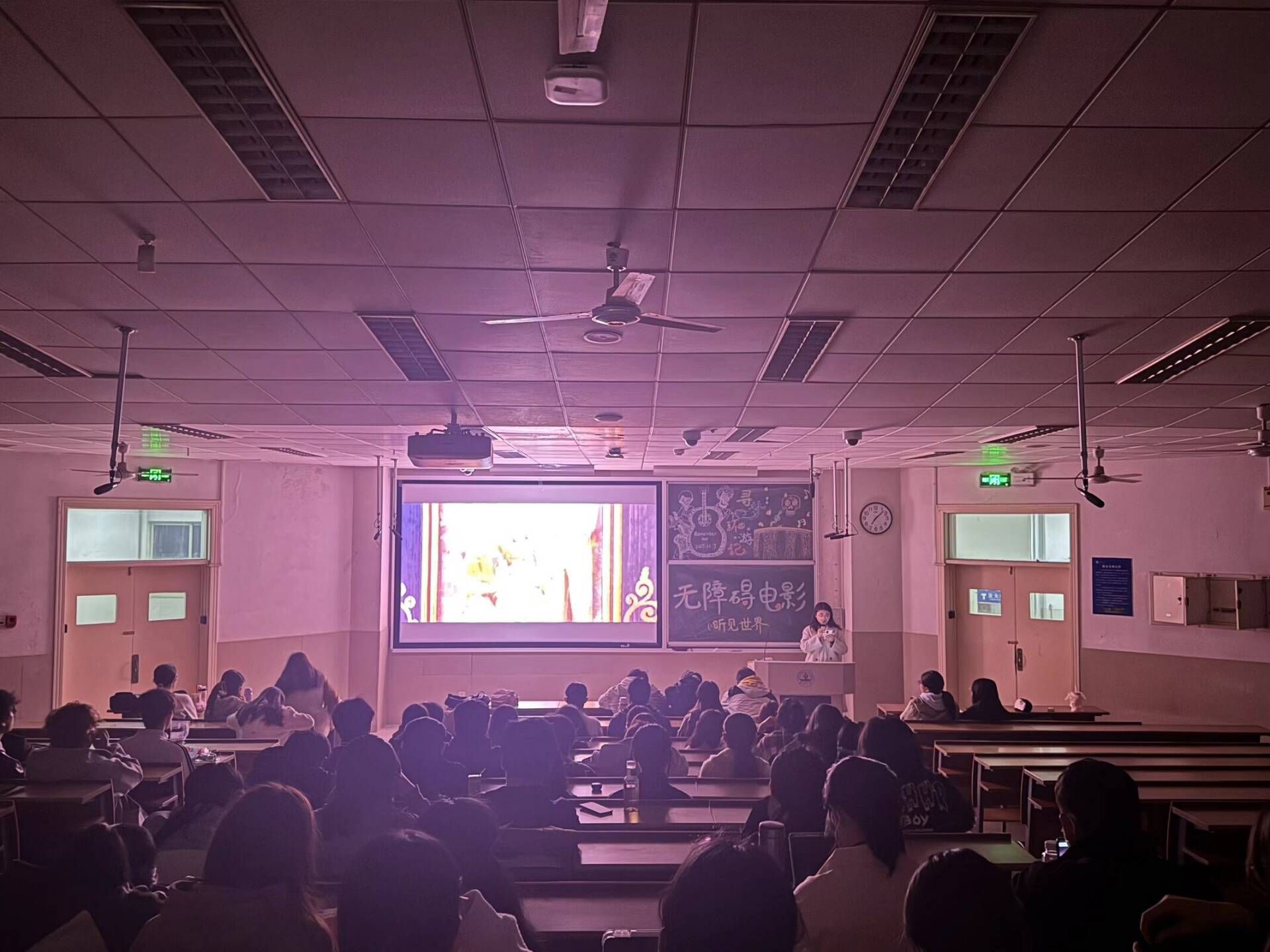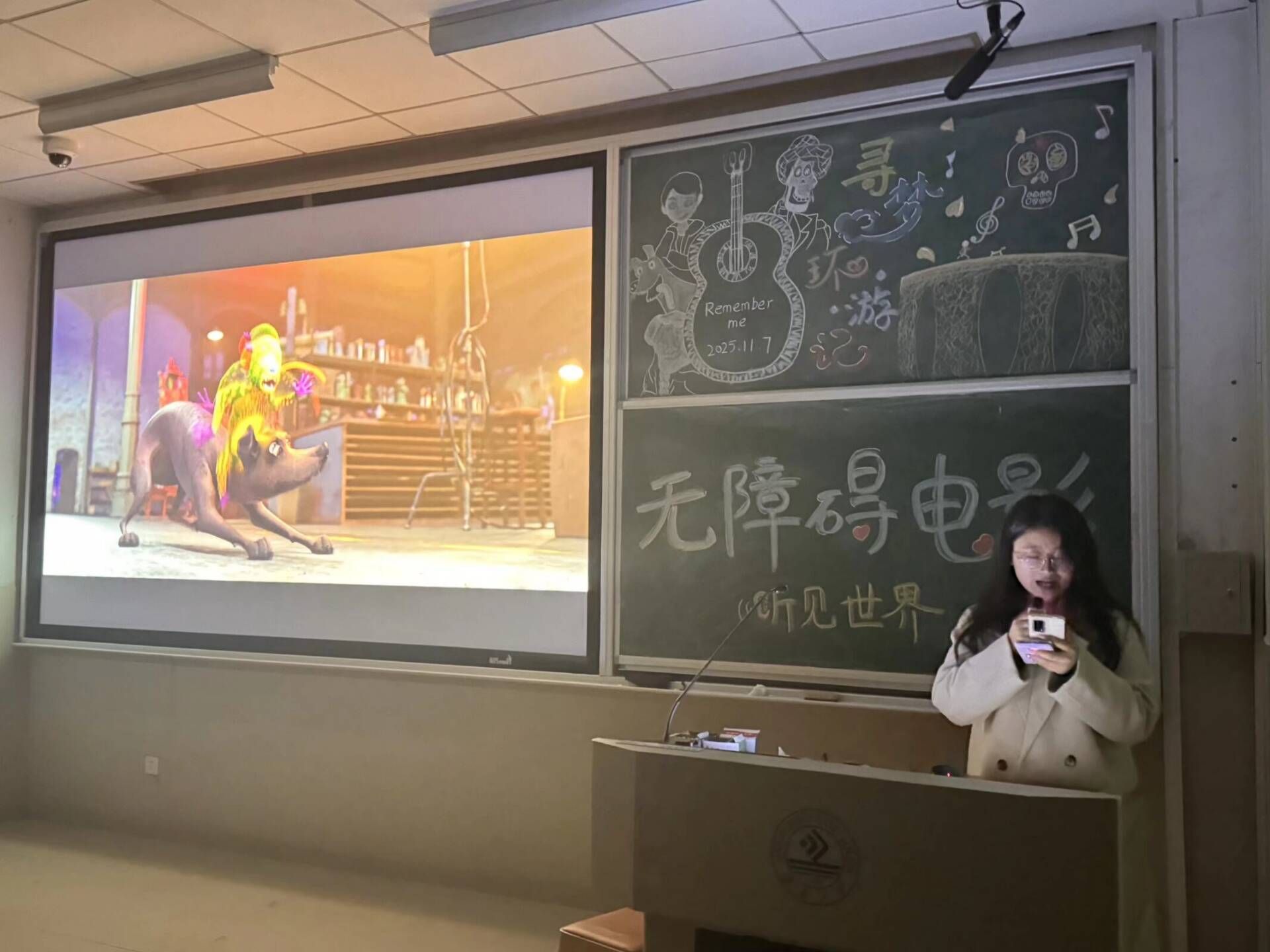 活动现场,同学们佩戴眼罩以隔绝视觉干扰,志愿者讲解员以细腻语言将电影画面转化为具象的听觉叙事:从场景氛围的明暗流转,到人物反应的细节变化,每一个镜头都被拆解为具象描述,引领大家“看见”完整的光影故事。在整个活动过程中,同学们将感官的重心落向听觉,深入体会盲人视角,体验到了以另一种形态铺展的世界。活动结束后,主办方随机采访两位同学,一位同学表示:“闭上眼后听觉格外敏锐,讲解员的声音像画笔,在脑海里勾勒出完整的画面,十分奇妙的体验。”另一位同学则分享:“这次‘黑暗’独处让我彻底放松,既感受电影魅力,又收获了内心的平静。”