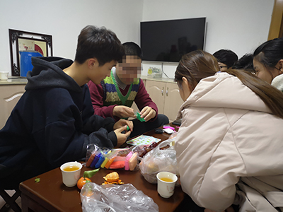 寒假结束,新学期伊始,志愿者们带着卷笔刀、彩笔等学习用品以及各色各样的水果来到特殊儿童小玮家并见到了小玮的奶奶。献上礼物的同时志愿者们殷切地询问着小玮新学期的学习状况和他刚过去不久的寒假生活。慰问过程中迟迟不见小伟的身影,听到奶奶说小玮还在公司时,志愿者们决定让小玮的奶奶休息一天,由他们来接小玮回家。在公司门口等待的小玮见到志愿者时便开始兴奋地挥手,回想起小玮成长中的点点滴滴,看着这个曾经的自闭症儿童由沉默不语到逐渐开朗再到如今将我们看做促膝谈心的家人,志愿者们深受感动。到家后,小玮奶奶端上了早已切好的水果。伴随着果香,志愿者们在午后的阳光中指导着小玮的作业,针对小玮学习中出现的薄弱项目进行着重辅导。指导完作业,小玮希望可以一起玩会儿游戏,当志愿者们表示同意时,小玮飞快地拿出了纸笔,邀请志愿者一起画画、折纸。冬日的暖阳逐渐西落,纸上小玮画的志愿者一行人也已然成型。这次雷锋日的特别活动也就此写下了一个温馨的句号。